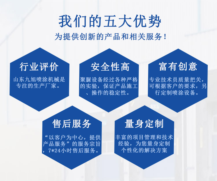 目前山東九旭機械設備已領跑中國液壓聚脲設備行業(yè),價格合理成為廣大客戶之首選。液壓聚脲噴涂機廠家所銷售產品主要來自國內及國際知名品牌,產品性能優(yōu)良,價格合理,專業(yè)的技術和完善的售后服務贏得國內外眾多客戶的誠摯贊賞........
